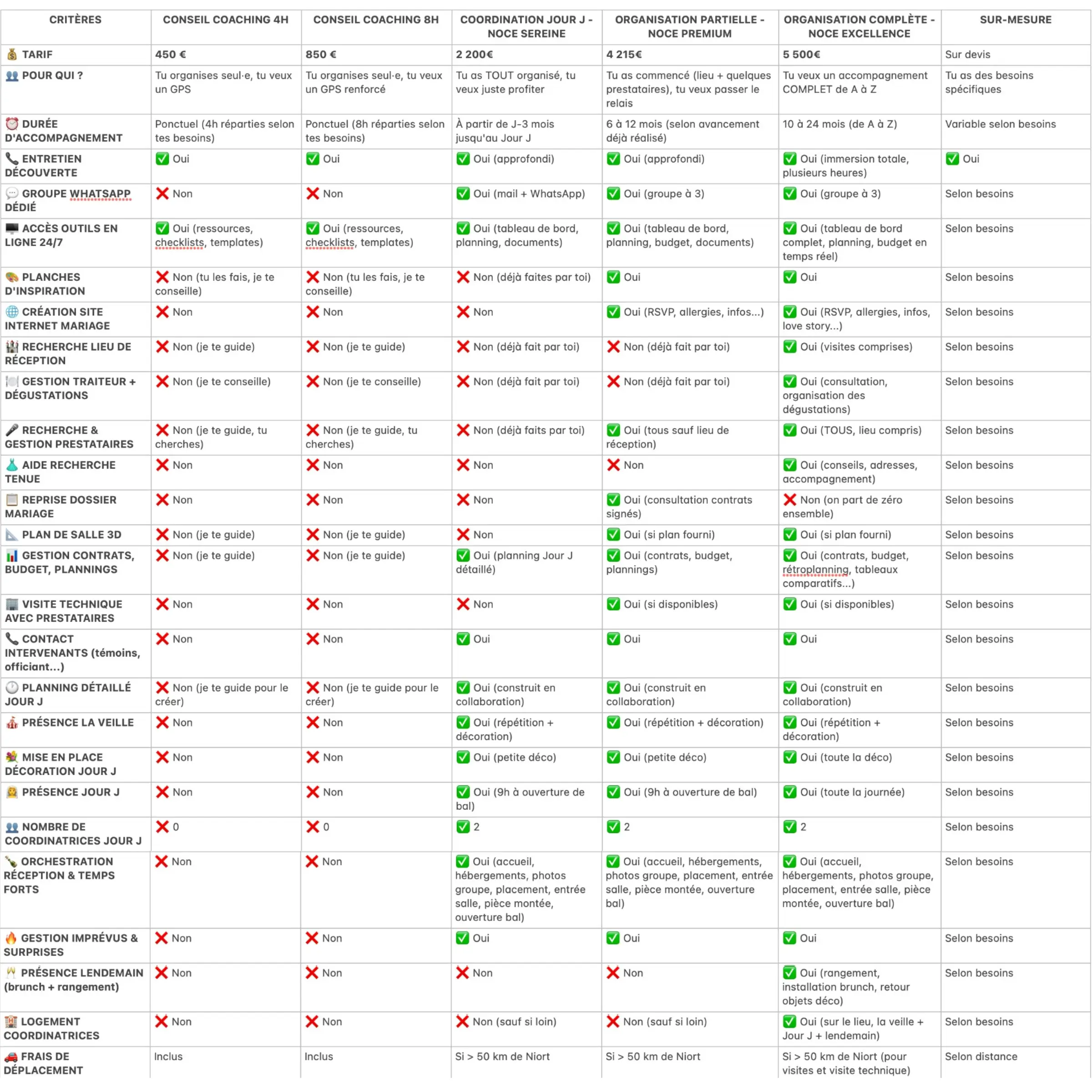 Ce tableau te permet de voir d’un coup d’œil toutes mes prestations — du conseil coaching 4h, au coaching renforcé 8h, jusqu’aux accompagnements complets comme la Coordination du jour J – Noce Sereine, l’Organisation partielle – Noce Premium, l’Organisation complète – Noce Excellence, ou encore la prestation sur-mesure.